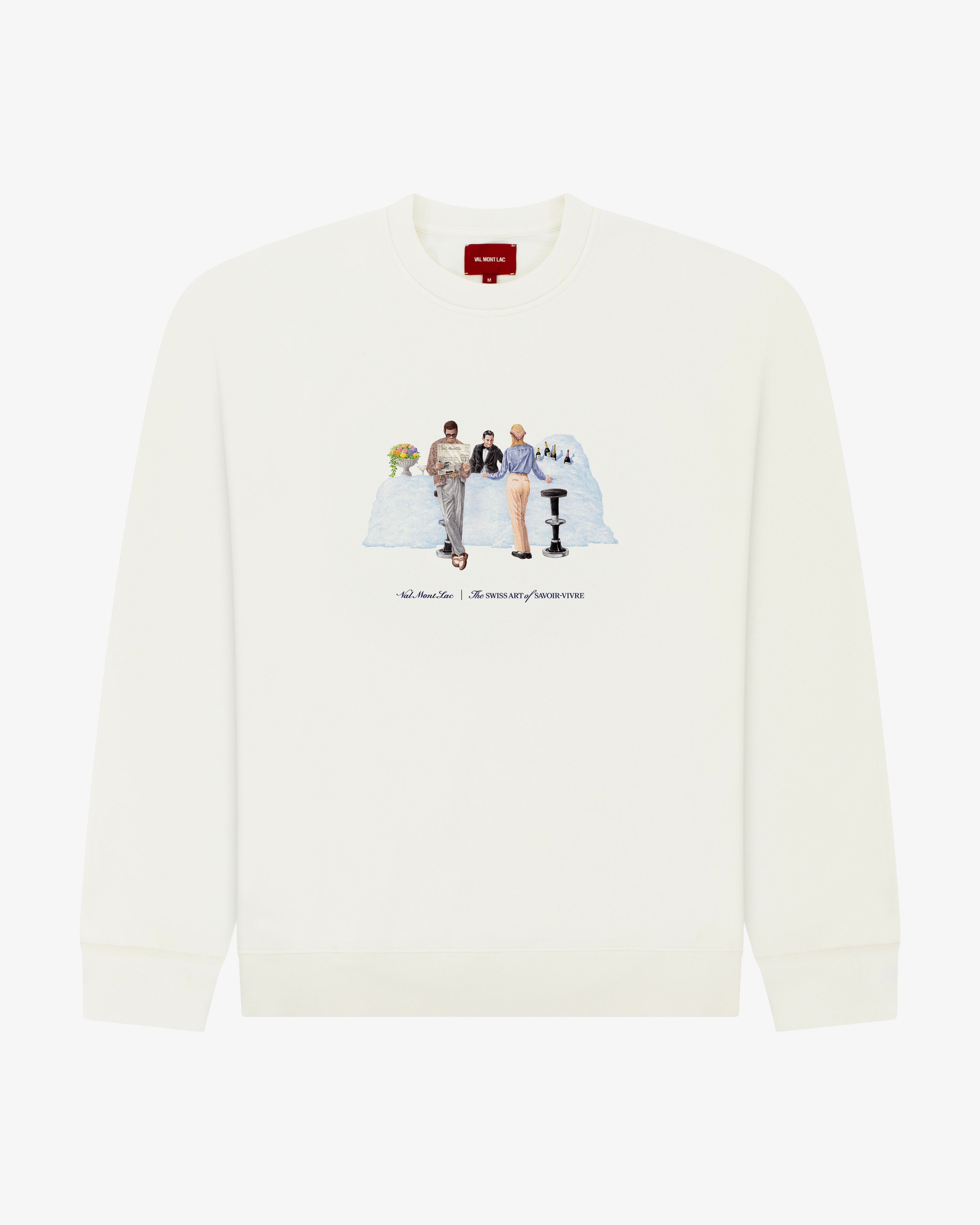 Part of Val Mont Lac’s Seasonal Graphics Collection, The Snow Bar Crewneck Sweatshirt celebrates the Swiss art of savoir-vivre, an ode to effortless elegance amidst alpine charm. The hand-drawn illustration, created by our Parisian artist, captures an iconic snow bar scene in the Swiss Alps. A modern tribute to the refined leisure and quiet confidence of Switzerland’s golden winter era.